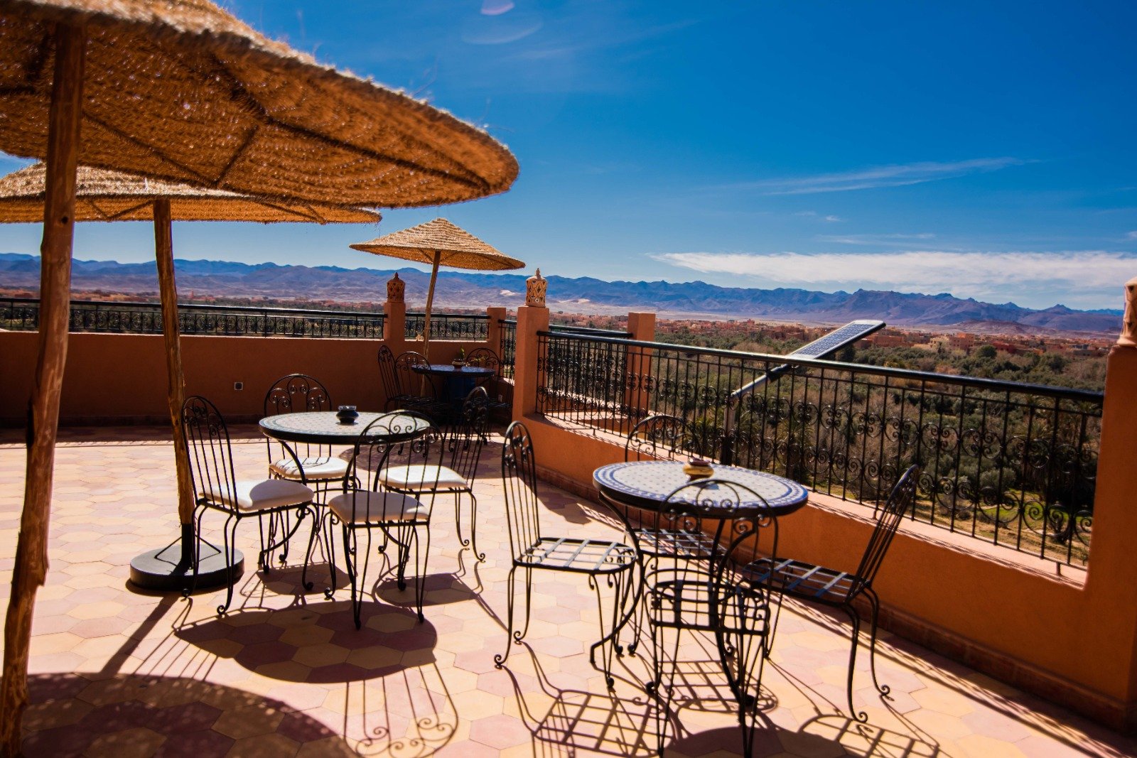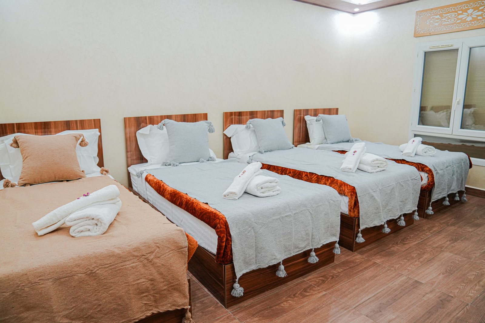 La chambre M’GOUN est située sur le Toit Terrasse (3iéme étage). Elle dispose de 4 lits simples de 90, d’une armoire et d’une fenêtre donnant sur le village. Climatisation réversible. Espace SDB WC partagé sur l’étage. Accès direct à la terrasse panoramique avec une vue exceptionnelle sur le village côté Nord et sur la palmeraie et l’Atlas côté Sud. Superbe vue plongeante sur la piscine également !