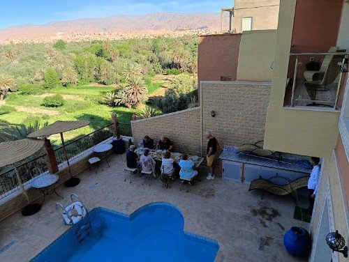 Quelle bonne nuit nous avons passée dans cet hôtel. L'accueil était super avec du thé et des biscuits. Nos fils sont allés directement dans la piscine et nous avons apprécié la terrasse environnante. La vue est phénoménale. La chambre était très soignée et répondait aux attentes, la vue depuis cette terrasse était encore plus belle qu'en bas. Après une bonne douche, nous aimerions nous promener dans l'oasis surplombée par l'hôtel. Notre hôte Ahmed a marché avec nous et nous a parlé de tout ce qui pousse là-bas. Après notre promenade, nos fils ont continué à jouer au football avec des garçons sur la place, après quoi nous avons pris un délicieux repas sur la terrasse à côté de la piscine. C'était une ambiance magique et nous avons apprécié cette nuitée lors de notre road trip à travers le Maroc.